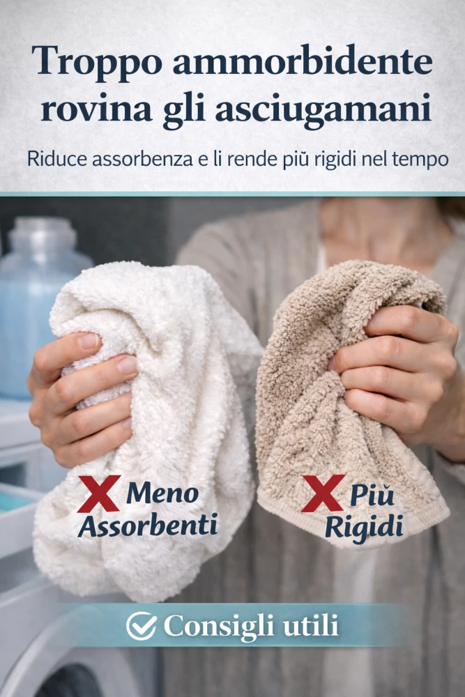 L’eccesso crea una sottile pellicola sulle fibre che riduce la capacità di assorbire e rende gli asciugamani meno efficaci e più rigidi.