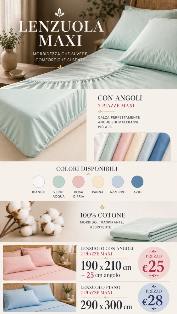 Lenzuola matrimoniali misura maxi.