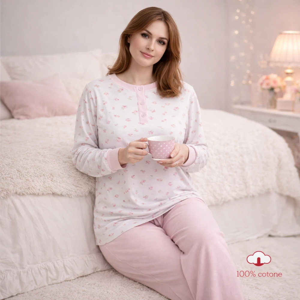La maglina di cotone leggera garantisce libertà di movimento e un comfort naturale durante tutta la notte, rendendolo un pigiama donna perfetto per ogni stagione. Il design femminile e raffinato unisce praticità e stile, ideale per chi ama sentirsi a proprio agio anche nei momenti di relax.Questo pigiama donna in cotone Made in Italy è realizzato con attenzione ai dettagli e alla qualità dei materiali, caratteristiche che distinguono i prodotti della linea Notti Magiche.