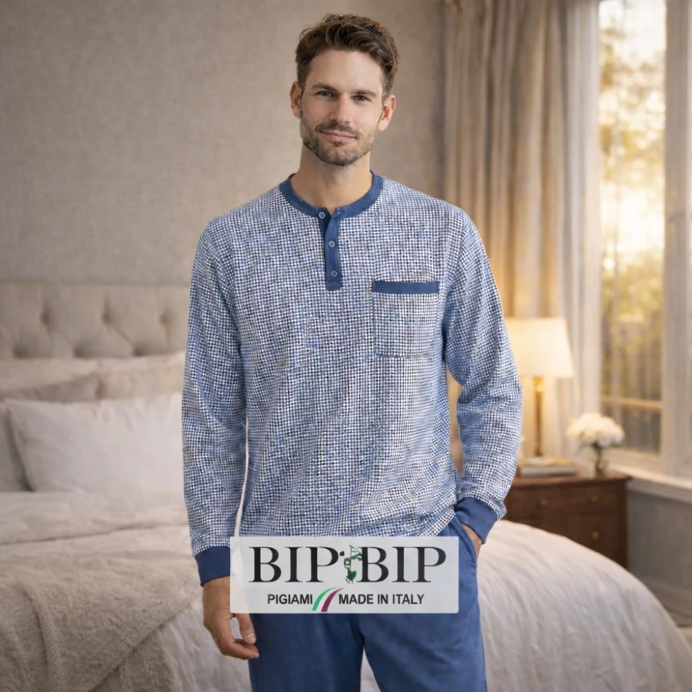 Comfort e stile per il riposo con questo elegante pigiama uomo BIP BIP in maglina di puro cotone, morbido e traspirante, ideale per tutte le stagioni.