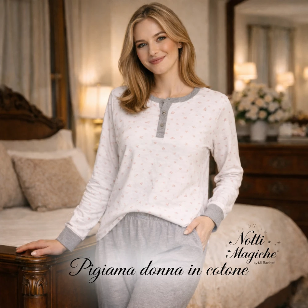 La maglina di cotone leggera garantisce libertà di movimento e un comfort naturale durante tutta la notte, rendendolo un pigiama donna perfetto per ogni stagione. Il design femminile e raffinato unisce praticità e stile, ideale per chi ama sentirsi a proprio agio anche nei momenti di relax.Questo pigiama donna in cotone Made in Italy è realizzato con attenzione ai dettagli e alla qualità dei materiali, caratteristiche che distinguono i prodotti della linea Notti Magiche.